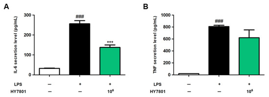 Next, we investigated whether HY7801 affects the secretion of pro-inflammatory cytokines by LPS-induced macrophages. Figure 2A shows that untreated, LPS-treated, and HY7801-treated cells secreted IL-6 at 32.74 ± 1.45, 256.16 ± 15.60, and 137.60 ± 12.39 pg/mL, respectively. LPS-induced increases in IL-6 levels were suppressed significantly by treatment with HY7801 (p < 0.001). As illustrated in Figure 2B, the secretion of TNF-α by LPS-induced cells was significantly higher (807.54 ± 21.05 pg/mL, p < 0.001) than that by untreated cells (20.34 ± 1.13 pg/mL). In addition, HY7801 suppressed TNF secretion relative to that in LPS-induced cells, although the difference was not significant. Therefore, the data suggest that HY7801 downregulates the secretion of pro-inflammatory cytokines.