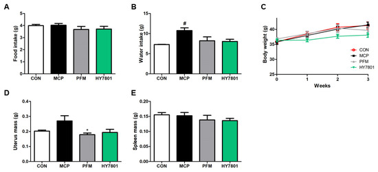 Effect of HY7801 on physiological indicators in mice with MCP-induced hyperprolactinemia. (A) Dietary intake; (B) water intake; (C) change in body weight; (D) mass of uterine tissue; and (E) mass of spleen tissue. Data are presented as the mean ± SE. # p < 0.05 vs. CON group; * p < 0.05 vs. MCP group. CON: non-treatment group; MCP: metoclopramide-induced mice; PFM: prefemin (100 mg/kg/day) + MCP; HY7801: Lactobacillus helveticus HY7801 (109 CFU/kg/day) + MCP.