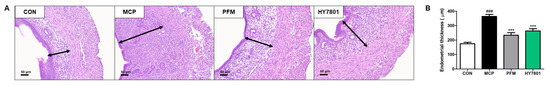 Histological analysis of uterine tissue from mice with MCP-induced hyperprolactinemia. (A) Hematoxylin and eosin-stained sections; 200× magnification; arrows point to the endometrium. (B) Endometrial thickness. Data are presented as the mean ± SE. ### p < 0.001 vs. CON group; *** p < 0.001 vs. MCP group. CON: non-treatment group; MCP: metoclopramide-induced mice; PFM: prefemin (100 mg/kg/day) + MCP; HY7801: Lactobacillus helveticus HY7801 (109 CFU/kg/day) + MCP.