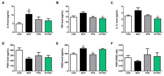 We examined the effects of HY7801 on the prostaglandin levels induced by MCP injection (Figure 6D–F). PGE1 levels in the CON, MCP, PFM, and HY7801 groups were 401.74 ± 46.49, 235.35 ± 34.30, 295.54 ± 13.53, and 261.17 ± 41.72 pg/mL, respectively, although the differences were not significant; however, PGE1 levels in the PFM and HY7801 groups were slightly higher than those in the MCP group. In contrast, the PGE2 levels showed the opposite trend. PGE2 secretion in the MCP group (520.20 ± 29.57 pg/mL, p < 0.05) was higher than that in the CON group (389.95 ± 27.54 pg/mL). In addition, the level of PGE2 in the PFM group was significantly lower (376.35 ± 36.38 pg/mL, p < 0.05) than that in the MCP group. PGE2 levels in the HY7801 (500.22 ± 22.78 pg/mL) group were slightly lower than those in the MCP group, but the difference was not significant. Furthermore, the PGE1/PGE2 ratio in the CON, MCP, PFM, and HY7801 groups was 0.129 ± 0.021, 0.094 ± 0.009, 0.157 ± 0.015, and 0.141 ± 0.019, respectively, but differences were not significant; however, after the administration of PFM and HY7801, the reduction in the PGE1/PGE2 ratio induced by MCP injection recovered to levels similar to those in the control group.