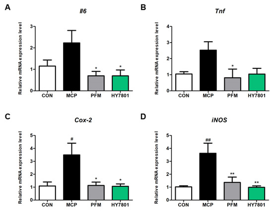 Finally, we asked whether HY7801 affects the expression of inflammation-related genes and enzyme-related genes in uterine tissues. As shown in Figure 7A, the relative expression of mRNA encoding Il-6 was higher (2.23-fold) in the MCP-treated group compared with that in the CON group (1.00-fold); however, Il-6 levels in the PFM- and HY7801-treated groups were significantly lower (0.70-fold) than in the MCP group (p < 0.05). HY7801 reduced the expression of Il-6 mRNA to a level similar to that in the positive control group. The expression of mRNA encoding Tnf was higher in the MCP group (2.53-fold) than in the CON group (Figure 7B), whereas treatment with PFM resulted in expression levels similar to those in the control group (0.81-fold, p < 0.05) and the HY7801 group (1.04-fold, n.s). The expression of Cox-2 was 3.50-fold, 1.13-fold, and 1.07-fold in the MCP, PFM, and HY7801 groups, respectively (Figure 7C). The MCP-induced elevation in Cox-2 expression was suppressed significantly by PFM and HY7801 (p < 0.05). As illustrated in Figure 7D, the increase in iNOS mRNA (3.62-fold, p < 0.01) after MCP induction was suppressed significantly via the oral administration of PFM (1.37-fold, p < 0.01) and HY7801 (0.98-fold, p < 0.01). Taken together, these results show that HY7801 downregulates the expression of mRNA encoding inflammation-related genes and enzyme-related genes.