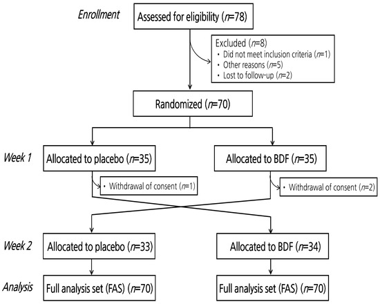 This study followed a randomized, double-blind, placebo-controlled, crossover design. Participants were randomly assigned to either the placebo group or the treatment (BDF) group in a 1:1 ratio one day prior to Visit 2 (Week 1) using a randomization method. At Visit 3 (Week 2), participants were crossed over to the alternate group. The study began with Visit 1 (Week 0), during which participants voluntarily signed informed consent forms. Eligibility was determined based on inclusion and exclusion criteria. After a 1-week run-in period, eligible participants were randomly assigned to either the BDF or placebo group according to the order of registration at Visit 2 (Week 1). They consumed either the treatment product or the placebo product, followed by a 1-week washout period. At Visit 3 (Week 2), participants were crossed over to the other group and consumed the respective product. The study was conducted at CHA Bundang Medical Center, CHA University (Seongnam, Republic of Korea). The study protocols were approved by the Institutional Review Board of CHA Bundang Medical Center, CHA University (CHAMC 2022-08-040-007). The study was registered with the WHO International Clinical Trials Registry Platform under the identification number KCT0009166.