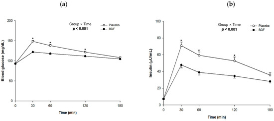 Effects of BDF on postprandial (a) blood glucose and (b) insulin secretion levels. BDF, barley dietary fiber. Each line represents mean ± SE. Linear mixed-effect model was used to analyze the difference between the groups and the effects of group × time. * p value < 0.05.
