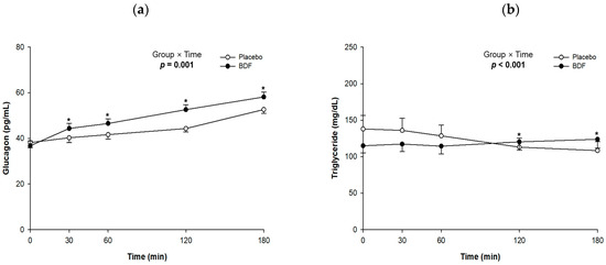 Effects of BDF on postprandial blood glucagon and triglycerides levels shown in Figure 3. Glucagon concentrations were similar before consumption, measuring 38.2 ± 2.3 pg/mL in the placebo group and 36.8 ± 2.1 pg/mL in the BDF group. However, after 120 min, glucagon levels increased to 44.3 ± 1.5 pg/mL in the placebo group and 52.6 ± 2.2 pg/mL in the BDF group. A significant interaction effect was observed over the 180 min period (p = 0.001).