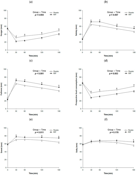 A visual analog scale (VAS) was used to assess participants’ subjective appetite sensations, including hunger, satiety, and prospective food intake. VAS assessments were conducted at baseline (0 min), following an overnight fast of at least 12 h, and subsequently at 30, 60, 120, and 180 min after the ingestion of either the BDF or placebo product with a 30 g glucose load.