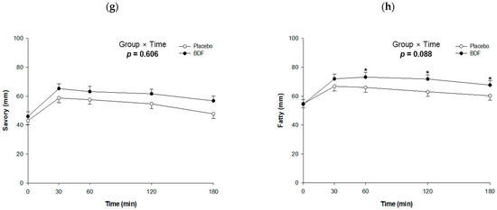 Effects of BDF on appetite parameters. (a) Hunger, (b) Satiety, (c) Fullness, (d) Prospective food consumption, (e) Sweet, (f) Salty, (g) Savory, (h) Fatty. Appetite measurements using the visual analog scale (VAS) showed comparable responses between the BDF and placebo groups. BDF, barley dietary fiber. Each line represents mean ± SE. Linear mixed-effect model was used to analyze the difference between the groups and the effects of group × time. * p value < 0.05.