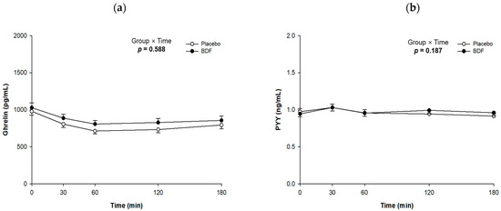 Ghrelin levels were highest in both groups immediately before food intake, but they gradually decreased until 60 min post-consumption, after which they plateaued (Figure 5a). The BDF group showed a ghrelin concentration of 807.5 ± 48.7 pg/mL, while the placebo group had a level of 713.8 ± 40.4 pg/mL 60 min after glucose loading. The BDF group exhibited higher ghrelin levels, reaching −49.5 pg/mL; however, there was no significant difference between the groups.