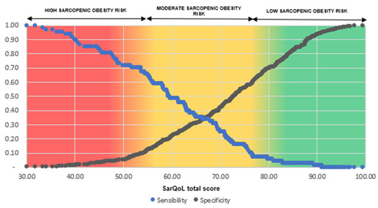 Considering the sensitivity and specificity in the diagnosis of SO for each total SarQoL score, researchers defined three levels of risk regarding the probability of developing SO, regardless of sex. A high risk of developing the condition was established for participants with scores below 53 points, a moderate risk was defined for scores between 54 and 77 points, and participants with scores above 77 points were categorized as low risk (Figure 2).