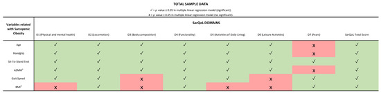 The statistical analysis utilized IBM SPSS Statistics v. 24 software for Windows (IBM Corp., Armouk, NY, USA). The normality of the data was assessed using the Shapiro–Wilk test. Descriptive statistics were computed for the SarQoL questionnaire [13] and its domains, as well as for variables concerning physical performance, obesity, and the diagnosis of SO. Differences between groups with and without SO were examined using the Student’s t-test and the Mann–Whitney U test, with significance set at p ≤ 0.05. Bonferroni correction was applied to avoid type 1 errors when conducting multiple comparisons. Pearson’s correlation coefficient was employed for normally distributed data, while Spearman’s correlation coefficient was used for non-normally distributed data. These tests evaluated relationships between variables contributing to SO diagnosis and results from the SarQoL questionnaire [13] and its domains. Variables showing significant differences underwent further analysis, with multiple linear regression used to assess their impact on domain scores and total SarQoL score.