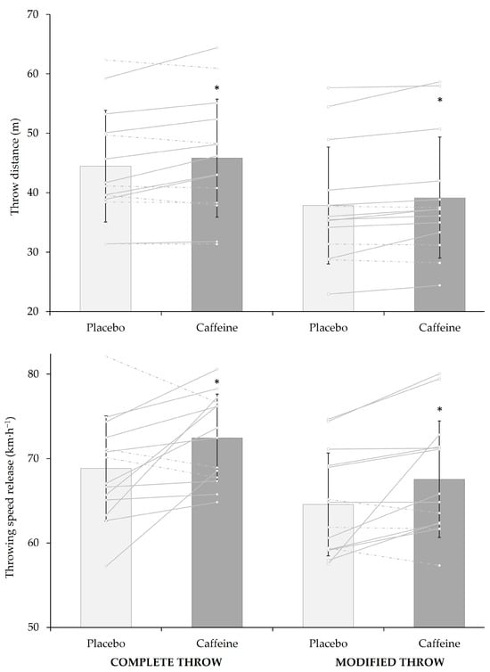 Individual responses for throwing distance (m) and speed release (km·h−1) in a complete throw (left panel) and a modified throw (right panel) after the ingestion of 3 mg·kg−1 of body mass of caffeine or placebo. Columns represent means, and black vertical lines represent standard deviations. Grey lines represent individual changes (straight lines depict increments in performance with caffeine ingestion, with respect to placebo, whilst dashed lines depict decrements in performance with caffeine). * Significantly different from placebo at p < 0.05.