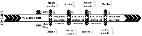 In the present study, a randomized, double-blinded, placebo-controlled, and crossover study design was used to assess the effects of MR intervention on the psychophysiological responses and kinematic profiles of 4-a-side SSG with MRINT or MRCON formats in adolescent soccer players. Before the MR intervention, the players completed the Yo-Yo Intermittent Recovery Test Level 1 (YYIRT-1) to divide them into two groups according to their aerobic fitness levels to avoid having unbalanced 4-a-side SSG groups in both games. Following a 15 min standardized warm-up section, consisting of jogging, sprinting, and integrating soccer-specific actions, the players performed 4-a-side SSG with MRINT or MRCON formats on a standard artificial grass pitch (Figure 2). After a 15 min standardized warm-up section, young players were instructed to rinse the solution (10 s with 25 mL of either a 6.4% maltodextrin solution (MR) or an identically flavoured aspartame solution (PLA)) in their mouth for 10 s and then expectorate back into the cup. The order of different SSG (MRINT or MRCON) and solutions (MR or PLA) was determined by randomization (www.randomization.com). Each game was then randomly played with six bouts of 4-a-side SSG, either MRINT or MRCON formats, at 72 h intervals to provide a psychophysiological recovery effect to the players. MRINT and MRCON were performed on standard artificial grass pitch under similar weather conditions (28–30 °C, temperature and 33–35%, humidity). Physiological responses and kinematic profiles were continuously monitored and recorded during all SSG. Psychological responses, such as RPE, RSME, and PES, were also determined at the end of each SSG. The players were given no tactical instructions or specific rules throughout the game, and numerous balls were placed around the pitch to ensure a continuous game. Their coaches verbally encouraged maximal effort during all SSG [10].