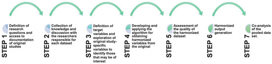 Retrospective data harmonization was performed according to existing guidelines [7]. The harmonization team consisted of epidemiologists, statisticians, and nutritionists. The process adopted to establish and harmonize the variables can be divided into seven steps as previously described [37]; the framework is displayed in Figure 1.