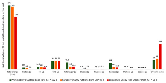 Nutritional value per 50 g of available carbohydrates (one serving size) of Thai desserts for testing. Note: Nutritional value data were retrieved from Namjud et al. [21], except for total sugar content, which was assessed in this study. The serving size was 50 g of available carbohydrates [26]. ND = not detected; GI = glycemic index; low GI ≤ 55, medium GI = 56–69, and high GI ≥ 70 [27].