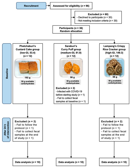 At the beginning of the study, at the baseline visit, the participants fasted overnight for 8–12 h before visiting. At the study center, their anthropometrics and vital signs were measured. Participants brought their fecal samples and dietary records. The fecal samples were preserved in 2 mL Eppendorf tubes containing PrimeStore MTM (a molecular transport medium that protects and stabilizes DNA and RNA) and transported on ice. The samples were stored frozen at −80 °C within 2 h after receipt until further analysis. The 36 participants were randomly assigned to one of three intervention groups (each group contained 12 participants) to consume three Thai desserts with varying levels of GI: group 1 received 192 g of Phetchaburi’s Custard Cake (low-GI dessert group), group 2 received 98 g of Saraburi’s Curry Puff (medium-GI dessert group), and group 3 received 68 g of Lampang’s Crispy Rice Cracker (high-GI dessert group). All desserts were portioned to provide 50 g of available carbohydrate content, and their nutritional values are described in the next section. Each dessert was weighed and purchased from the same production batch to control the nutrient composition. Participants consumed the Thai dessert portion provided in 15 min, with 150 mL of still water as the only beverage. After that, a standard breakfast meal was provided (grilled mackerel, Japanese style, with white rice; energy 538.8 kcal; carbohydrate 70.6 g; protein 20.1 g; fat 19.5 g). Subsequently, they were still provided with recommendations on the dietary intake for lunch and dinner. At the end of the study (after 24 h of intervention), the participants visited the study center again to bring their fecal samples and dietary records.