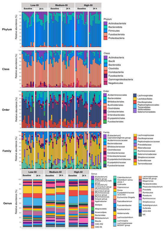 The gut microbiome of 30 participants in all three dessert groups was profiled through a total of 6,243,685 paired-end reads obtained from 16S rRNA gene next-generation sequencing. The raw reads were subsequently processed by trimming adapters, filtering out low-quality reads, merging paired-end reads into consensus sequences, screening for non-chimeric reads, and removing mitochondrial 16S rRNA. At baseline, 103,607.3 ± 20,314.5 reads were obtained from the low-GI dessert group, 96,832.2 ± 18,274.6 reads for the medium-GI dessert group, and 87,621.4 ± 14,144.6 reads for the high-GI dessert group. After the 24 h intervention, the number of reads in these groups was 116,696.2 ± 15,660.9, 120,812.6 ± 30,058.8, and 98,798.8 ± 13,159.5, respectively. There were no significant differences in sequence read numbers between all dessert groups, both at the baseline (p = 0.150) or after the 24 h intervention (p = 0.076). The bacterial taxonomic identification based on 16S rRNA gene sequences revealed that the gut microbiota in participants was composed of 11 phyla, 16 classes, 37 orders, 80 families, and 227 genera (Supplementary Tables S1–S5). However, when focusing on only the top 100 taxa, merely five phyla, eight classes, 14 orders, 20 families, and 41 genera dominated the gut microbiome profile, as shown in Figure 3.