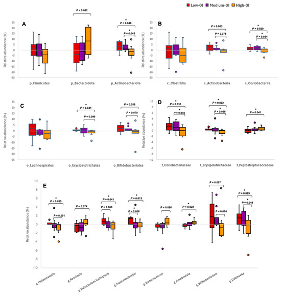 The changes in relative abundance of all identified taxa after consuming three Thai desserts were calculated with the following formula: the relative abundance (%) at the 24 h intervention minus the relative abundance (%) at the baseline for each participant and identified taxon. Subsequently, the changes in the relative abundance of some dominant phyla, classes, orders, families, and genera in each dessert group were statistically analyzed and represented as boxplots, as shown in Figure 4. At the phylum level (Figure 4A), the median change in Bacteroidota was slightly increased in the high-GI dessert group compared to the medium-GI dessert group. However, the median change in Actinobacteriota was significantly decreased in the high-GI dessert group compared to the low-GI and medium-GI dessert groups. The median change in Actinobacteria at the class level (Figure 4B) was slightly decreased in the high-GI dessert group compared to the low-GI and medium-GI dessert groups. On the other hand, the median change in Coriobacteriia was significantly different between the groups, with an increase in the low-GI and medium-GI dessert groups compared to the high-GI dessert group. In the order Erysipelotrichales (Figure 4C), the median change in the high-GI dessert group showed a significant decrease compared to the low-GI dessert group, but a slight decrease in the medium-GI dessert group. Similar results were also observed in Bifidobacteriales, in which the median change in the high-GI dessert group decreased when compared to the low-GI and medium-GI dessert groups, however, both without significance. At the family level (Figure 4D), the median change in Coriobacteriaceae in the low-GI and medium-GI dessert groups increased significantly compared to the high-GI dessert group. In Erysipelotrichaceae, the high-GI dessert group had a significant decrease in median change compared to low-GI and medium-GI dessert groups. On the other hand, in Peptostreptococcaceae, the high-GI dessert group showed a significant increase in the median change compared to the low-GI dessert group.