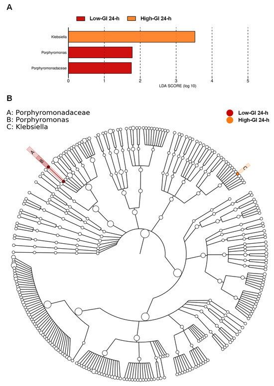 The gut microbial taxa determined as dominant biomarkers for association with the consumption of Thai desserts. After the 24 h intervention in the low-GI and high-GI dessert groups, the three taxa, the family Porphyromonadaceae, and the genera Porphyromonas and Klebsiella were determined as dominant biomarkers as analyzed by LEfSe with an LDA score ≥ 1.0 (A). Cladogram exhibiting the phylogenetic distributions of gut microbiota (B).