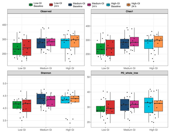 Our study’s randomized controlled design enhances the reliability of the findings, but limitations include the small sample size, short intervention period, and partial control over participants’ non-study meals. While a 24 h period may not fully capture longer-term impacts on the gut microbiota, it provides insight into immediate responses to GI variations. The lack of significant differences in alpha and beta diversity indices may reflect the limited timeframe. Nonetheless, the design approximates real-world dietary scenarios, allowing the exploration of how short-term dietary changes affect the microbiome [104].