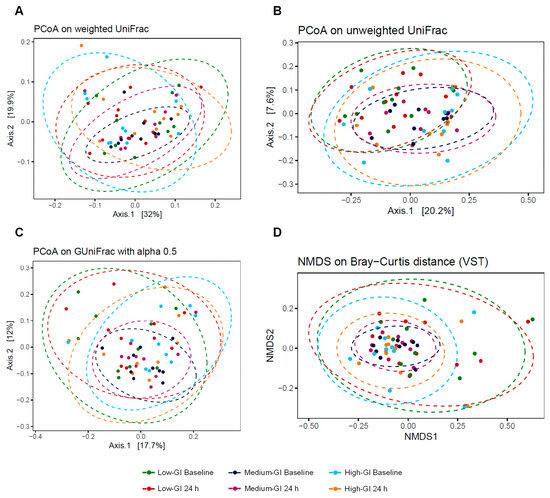 The alpha and beta diversity indices were analyzed to measure the diversity of the gut microbiota after 24 h of consumption of three desserts. The alpha diversity refers to the intra-individual diversity or diversity of a single sample group, while the beta diversity refers to the inter-individual diversity and would be used to estimate the similarity or dissimilarity between the sample groups. For alpha diversity, four indices including observed ASVs, bacterial richness with Chao1, bacterial evenness with Shannon, and PD whole tree were used to measure the diversity of the gut microbiome of 10 participants at the baseline and after the 24 h intervention in the low-GI, medium-GI, and high-GI dessert groups. The results of the analysis showed that there were no significant differences between the low-GI, medium-GI, and high-GI dessert groups in any alpha diversity indices at the beginning and after the test (Figure 6), which indicated that there were no differences in the diversity of the gut microbiome among the participants consuming all desserts. These similarities were also supported by the beta diversity indices including PCoA on weighted and unweighted UniFrac distances, GUniFrac distances, and NMDS based on Bray–Curtis dissimilarity. The statistical analysis by the PERMANOVA test showed that the gut microbiota composition at baseline and after the 24 h intervention was very close in all dessert groups, with no significant difference in any beta diversity indices, as shown in Figure 7. The findings of alpha and beta diversity analyses hence suggested that the gut microbiome profiles of participants at baseline and 24 h after consumption of all desserts were still similar in bacterial structure.