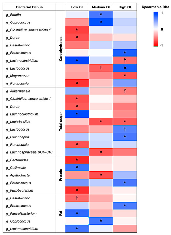 Correlation between dietary nutrient intake and the relative abundance of gut microbiota at the genus level. The correlation data were analyzed by Spearman’s rank correlation coefficient. Asterisks (*) indicate statistically significant Spearman’s rho (ρ) values at p < 0.05, while daggers (†) indicate the tendency of correlation at 0.05 ≤ p < 0.10.