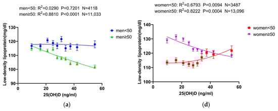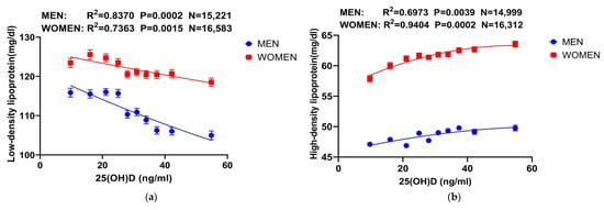 We also analyzed the age-dependency by dividing the subjects into two age groups for comparative analysis. For 25(OH)D, a positive correlation with HDL was evident across all age groups for both men and women. The relationships of LDL and TC with 25(OH)D, however, were more complex. In men, no significant association with 25(OH)D was observed until age 50, with levels remaining stable as 25(OH)D increased. In men over 50, 25(OH)D was inversely associated with LDL and TC. Interestingly, in women, 25(OH)D correlated positively with LDL and TC below age 50, with this trend reversing to a negative correlation after age 50. See Figure 4 and Supplementary Figure S1 for details.
