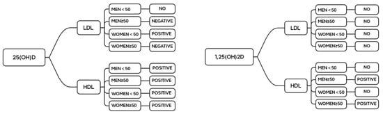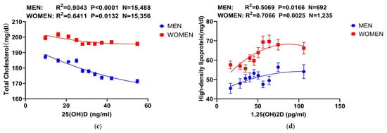 The following supporting information can be downloaded at: https://www.mdpi.com/article/10.3390/nu16223936/s1, Figure S1: Correlation of vitamin D with lipids in people under 50 years of age. In the under-50 population, for 25(OH)D, women were positively associated with all three lipid parameters, whereas men were positively associated only with HDL. In contrast, 1,25(OH)2D did not correlate with any of the lipids in people under 50 years of age. Abbreviations: 25(OH)D: 25-hydroxy-vitamin D; 1,25(OH)2D: 1,25-dihydroxy-vitamin D; Figure S2: Correlation of vitamin D with lipids in people over 50 years of age. After the age of 50 years, for 25(OH)D, the correlations with LDL and TC reversed to negative in women and remained positive for HDL, whereas in men the correlations with the three lipid parameters were the same as in women. For 1,25(OH)2D, after the age of 50 years, the correlation was positive only for HDL, and there were no significant correlations with LDL and TC in either sex. Abbreviations: 25(OH)D: 25-hydroxy-vitamin D; 1,25(OH)2D: 1,25-dihydroxy-vitamin D.