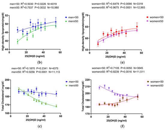 Correlation between 25(OH)D and lipids by gender and age. The correlation curves of 25(OH)D with lipids at different ages in the male group are represented in (a–c). Before the age of 50, LDL and TC were not significantly correlated with 25(OH)D, and their concentrations did not change in response to changes in the concentration of 25(OH)D; after the age of 50, LDL was negatively correlated with TC. HDL showed a positive correlation with 25(OH)D in males at any age. The correlation curves of 25(OH)D with lipids at different ages in the female group are represented in (d–f). Before 50 years of age, LDL and TC showed a positive trend of correlation with 25(OH)D, and after 50 years of age, a negative correlation was observed. HDL showed a positive correlation with 25(OH)D at any age in females. Abbreviations: 25(OH) D: 25-hydroxy-vitamin D; 1,25(OH)2D: 1,25-dihydroxy-vitamin D.