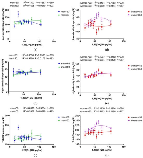 Correlation between 1,25(OH)2 vitamin D and lipids by gender and age. (a–c) represent the correlation curves of 1,25(OH)2D with lipids at different ages in the male group. (d–f) show the correlation curves of 1,25(OH)2D with lipids at different ages in the female group. LDL and TC were not correlated with 1,25(OH)2D at any time in either sex. For HDL, a correlation with 1,25(OH)2D was shown only after the age of 50 years in either men or women. Abbreviations: 25(OH) D: 25-hydroxy-vitamin D; 1,25(OH)2D: 1,25-dihydroxy-vitamin D.