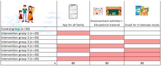 The 160 families recruited in each country will be randomly assigned into eight study groups (n = 20 families per group per country) according to a multi-component intervention including different combinations of the three study components (artificial intelligence (AI)-based app for all family; educational materials and empowerment activities for adolescents; and healthy plant-based snacks for children) and a control group that will receive basic Mediterranean guidelines for parents and their children (Figure 1).