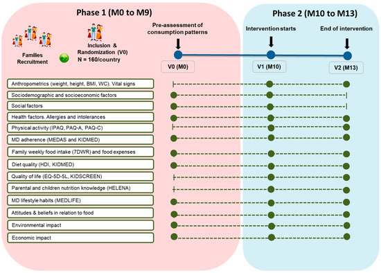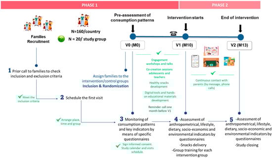 Phase 1 (month 0 to month 9): preassessment. The families will be recruited and included in this study; they will be randomly assigned to the different study groups; and consumption patterns and sociodemographic, socioeconomic, and environmental indicators will be evaluated through specific questionnaires. In addition, the different educational materials and activities, AI-based app, and healthy plant-based snacks will be developed prior to the start of the intervention study. This information will help us understand the context of each participant group and inform our analysis.