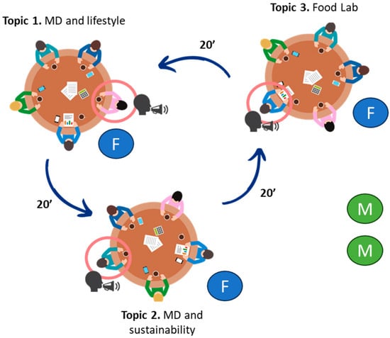 The educational activities will be part of an educational program specially designed to improve adherence to the MD of adolescents. The program will be conducted outside of school hours during the 3-month intervention and will be previously designed during Phase 1 of this study under the umbrella of three selected topics: (1) Mediterranean Diet and Lifestyle: discovering cultures, foods, and tastes; (2) Mediterranean Diet: from a healthy diet to a sustainable dietary pattern; and (3) Food Lab: kitchens from research or cooking centers as experimental hands-on zones for the application of healthy and sustainable dietary patterns. At least two cocreation sessions will be organized in each study country, with adolescents assigned to the educational activity groups as cocreators. The World Cafe Methodology [37,38,39] will be applied, encouraging participants to talk to each other and discuss the three selected topics in small groups in a cozy café-style space hosted by researchers as moderators (Ms) and high-school teachers as facilitators (Fs). Each session will take around one-and-a-half hours and will be joined by about 12 adolescents and at least 2 teachers and 2 researchers who will be neutral and encourage participation. The adolescents will be divided into three tables (4 to 5 adolescents per table) and, at each table, one of the three selected topics will be discussed so that the adolescents will rotate around every 20 min to participate in the discussion of all the topics (Figure 3). The researchers will record all the conversations that take place on a smartphone and will also take written notes. Once all the discussion rounds have finished and after a coffee break, the entire group will meet again in plenary. The resulting activities from each table will be summarized by researchers who will bring down the number of generated ideas to a handleable minimum, focusing on those factors generally considered to be the most important. Finally, the participants will vote on the results to prioritize actions to be implemented as educational activities in the frame of the educational program. After the cocreation session, all the data will be gathered and analyzed by the researchers in each country. The codesigned activities will then be reprioritized by all participants via an online survey. Lastly, the researchers will select and develop the 12 most voted educational activities, with 4 per topic, to be implemented within the framework of the intervention study.