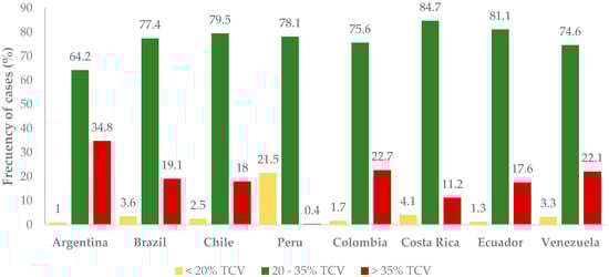 As shown in Figure 1, the majority of individuals (64.2% to 84.7%) meet the recommended intake levels, with Costa Rica standing out as the country where the population most adheres to the guidelines followed by Ecuador and Argentina as the countries with the lowest compliance. Notably, Argentina also has the highest percentage of individuals exceeding the recommended intake, followed by Colombia, Venezuela, and Brazil. In contrast, Peru has the highest percentage of individuals who tend to follow a low-fat diet (<20% TCV) (Figure 1).