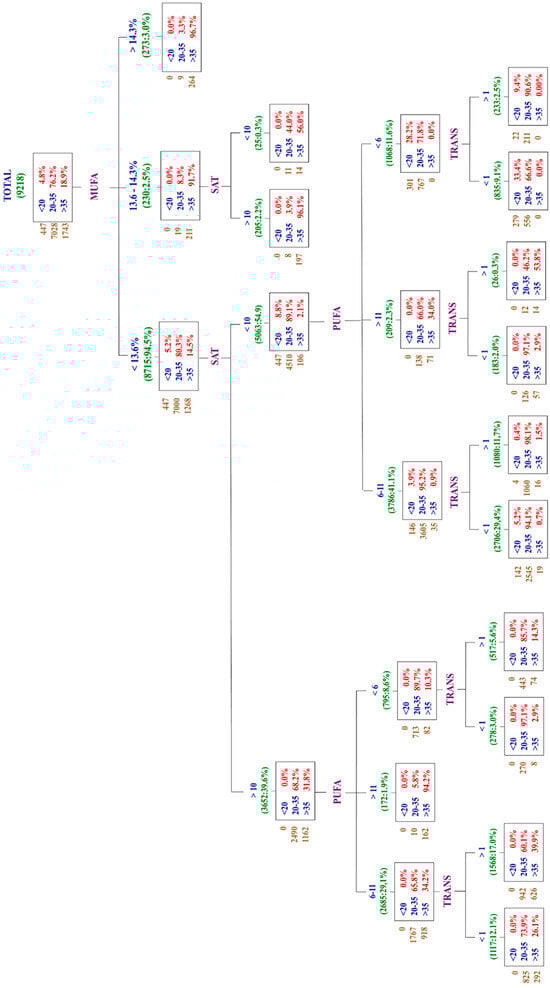 It should be highlighted that MUFA, in the decision tree, is identified as having the largest capacity to explain the total consumption of fats, because of the categories of consumption: low (<13.6%), within (13.6–14.3%) or higher than (≥14.3%) of the recommendations do establish the most important differences in the distribution of the participants according to their consumption of total fats (p < 0.001)