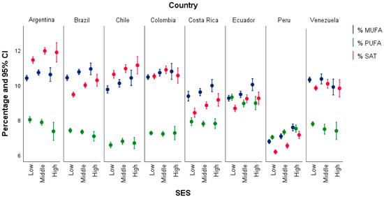 Analyzing the contribution of energy coming from the components of total fat by country and SEL, it can be observed that the averages of SFA and MUFA in all countries does not differ between upper and middle social classes, decreasing significantly in the lower social class. In Argentina, Brazil, and Venezuela, the energy coming from PUFA in the lower social class is relatively higher or similar than the middle class; in Colombia, Ecuador, and Chile there are not differences by social classes; Peru, in contrast to the other countries, presents a markedly different behavior: the energy contribution by the different components of fats is significantly different by social class, and it is also found in addition that the contribution determined by SFA is significantly lower than that corresponding as MUFA and PUFA, in all social classes. The energy provided by TRANS is similar in all countries except in Costa Rica and Brazil, which are the countries with the highest level of TRANS intake (Figure 3).