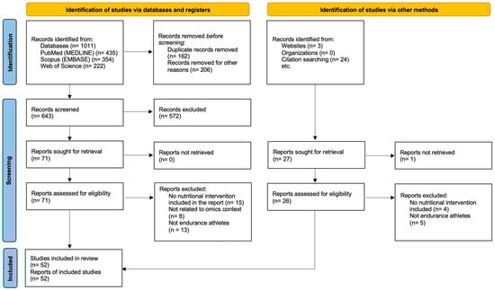 Steps for conducting this review were adopted from the five-step approach [21]. The review was conducted in accordance with the PRISMA extension for scoping reviews [22] (Supplementary File). A scoping review methodology was selected based on the need to identify the type and extent of the research in the evolving field of precision sports nutrition and to identify research gaps. A comprehensive literature search was conducted in PubMed (MEDLINE), Scopus, and Web of Science between 1 June and 5 August 2024 and updated on 18 October 2024. Additionally, Google Scholar was used to assess gray area literature and to identify any missing articles. Citation searching, including reviewing reference lists of included studies and forward citation tracking, was also employed to ensure all relevant studies were captured. Search strings were developed and independently tested by two authors (L.B. and F.C.) to ensure the collection of relevant studies and to minimize any potential biases. Research questions, search strategies, and eligibility criteria were guided by the broad Population–Concept–Context (PCC) framework recommended by the Joanna Briggs Institute for scoping review [23]. The search terms encompassed three primary domains: (1) personalized and/or sports nutrition, (2) endurance athletes, and (3) systems biology approaches, including wearables technology. Detailed search strategies for each database can be found in the Supplementary File.