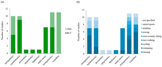 Number of studies identified across individual ‘omics’ or wearables platforms, stratified by (a) randomized controlled trials (RCTs) versus other study designs; (b) type of endurance sports studied.