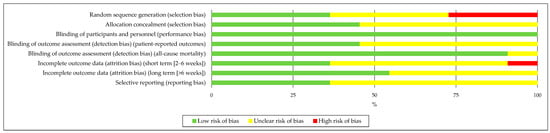 The checklist items were classified into different domains: random sequence generation (selection bias), allocation concealment (selection bias), blinding of participants and staff (implementation bias), blinding of outcome assessment (detection bias), incomplete outcome data (attrition bias), selective reporting (reporting bias), and other types of bias. They were classified as ‘low’ if they met the criteria for insignificant risk of bias (plausible bias unlikely to seriously alter the results) or ‘high’ if they met the criteria for elevated risk of bias (plausible bias that seriously undermines confidence in the results). If the risk of bias was unknown, it was considered ‘unclear’ (plausible bias that raises some doubt about the results) [].
