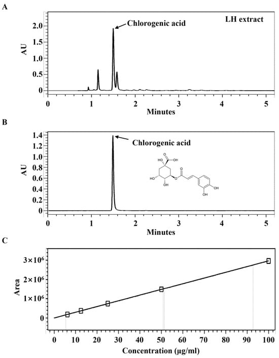 Ultra-performance liquid chromatography (UPLC) analysis of leaf of honeysuckle (LH) extract. Chromatogram of (A) LH extract and (B) chlorogenic acid as standards at 326 nm. (C) Calibration curve of chlorogenic acid.