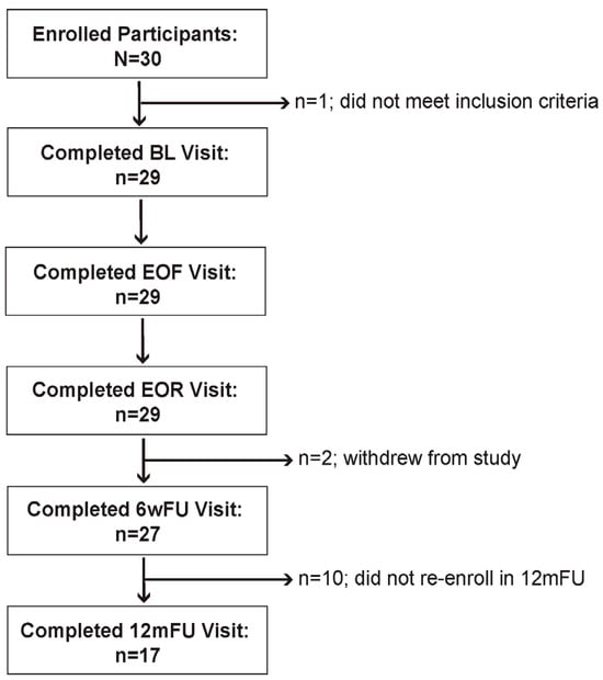 Enrollment and participation flow diagram. See “Participant Enrollment and Study Protocol” in the “Materials and Methods” section and “Participant Characteristics” in the “Results” section for details on eligibility and data collection. N, number of participants; BL, baseline; EOF, end-of-fast; EOR, end-of-refeed; 6wFU, six-week follow-up; 12mFU, 12-month follow-up. At EOF visit, 2/29 participants began refeeding before the blood draw and were excluded from serology and urinalysis. At the 6wFU visit, 2 out of 27 provided incomplete data: one provided all data except for anthropometric measurements, and one provided only blood pressure data.