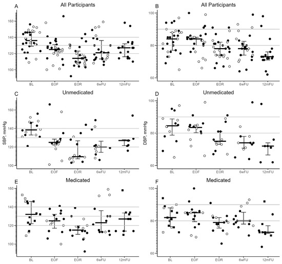 SBP (A,C,E) and DBP (B,D,F) by visit of all participants (A,B) and by baseline medication status (unmedicated (C,D,) and medicated (E,F)). Graphs include individual values as well as first (lower) and third (upper) quartiles and the median value. Circles and squares in panels (C–F) represent unmedicated and medicated SBP/DBP, respectively. Participants who attended the 6wFU visit (n = 27) and 12mFU visit (n = 17) are depicted as unfilled (open) and filled (black) symbols, respectively. Horizontal gray lines represent severity of HTN: SBP 120–129 mmHg, elevated blood pressure; SBP/DBP ≥ 130/80 mmHg, Stage 1 HTN; SBP/DBP ≥ 140/90 mmHg, Stage 2 HTN. A total of 3/29 and 12/29 participants did not provide data at 6wFU and 12mFU visits, respectively. SBP, systolic blood pressure; DBP, diastolic blood pressure; mmHg, millimeter mercury; BL, baseline; EOF, end-of-fast; EOR, end-of-refeed; 6wFU, six-week follow-up; 12mFU, 12-month follow-up; HTN, hypertension.