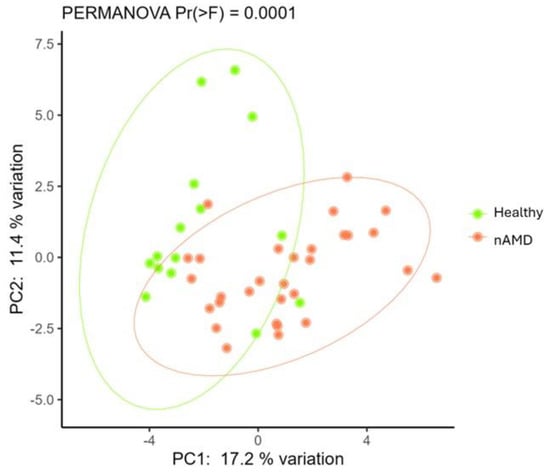 First, an assessment was conducted to determine whether patients with nAMD exhibited a different intestinal microbiota structure compared to HC. The PCoA plot, computed using the Hellinger distance metric, showed a significant separation (PERMANOVA, p < 0.0001) among stool samples from HC and nAMD patients (Figure 1).