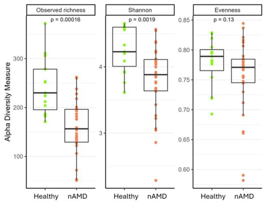 Box plots showing fecal alpha diversity indices (observed ASV richness, Shannon index, and Pielou’s evenness) between HC and nAMD patients.