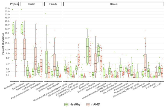 Subsequently, differential abundance analyses were performed at all taxonomic ranks, identifying several taxa with differential abundances in stool samples from HC and nAMD patients (Figure 3 and Table S2).