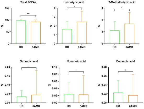 Bar plots representing the significant fecal acid abundances among HC and nAMD patients. Analyses were assessed using the Mann–Whitney test, and p-values less than 0.05 were considered statistically significant. The asterisks (*) represent p-values; * p < 0.05, *** p < 0.001.