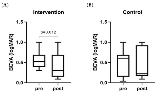 Concerning ophthalmological parameters, the effects on BCVA, expressed as the median (IQR) of the log of the minimum angle of resolution (logMAR), were evaluated. Notably, micronutrient supplementation led to a significant improvement in visual acuity (BCVA pre: 0.52 (0.39–0.60), BCVA post: 0.30 (0.15–0.69); p = 0.012) (Figure 5A). In contrast, no significant changes were observed in the control group (BCVA pre: 0.60 (0.15–0.69), BCVA post: 0.69 (0.15–1.00); p = 0.882) (Figure 5B).