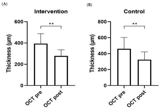 Additionally, a significant reduction in OCT was observed in both the intervention (p = 0.001) (Figure 6A) and control (p = 0.001) (Figure 6B) groups.