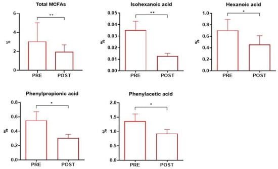 As shown in Figure S1A, no significant differences were observed in the various alpha diversity indices following micronutrient supplementation, and no distinct separation was observed between pre- and post-intervention samples (PERMANOVA, p = 0.7505) (Figure S1B). However, in terms of GM function, micronutrient supplementation led to a significant reduction in the total amount of MCFAs (p = 0.008), as well as in levels of isohexanoic (p = 0.005), hexanoic (p = 0.037), phenylacetic (p = 0.040), and phenylpropionic (p = 0.018) acids (Figure 7 and Table S6).
