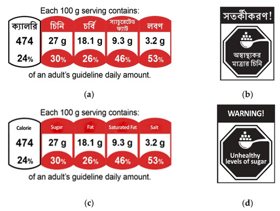 Example front-of-package labels. (a) Example GDA label. (b) Example warning label for sugar. (c) Example GDA label in English. (d) Example warning label in English.