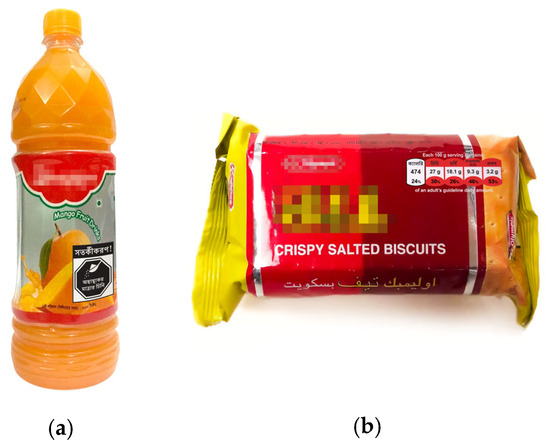 To show the FOPLs in the context of real food purchasing decisions, we displayed the labels on digital images of real Bangladeshi food products, with product brand information blurred as seen in Figure 2.