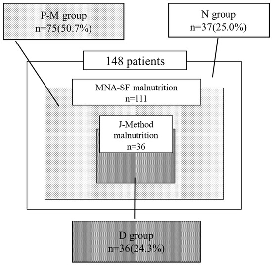 The results of nutritional screening using the J-Method and MNA-SF. The J-Method and MNA-SF identified 36 and 111 patients as having malnutrition, respectively. Although 37 patients (25.0%) are classified as “N”, 36 (24.3%) are classified as “D” when combining the J-Method and MNA-SF. Notably, 75 patients (50.4%) are classified as having malnutrition by the MNA-SF but as non-malnutrition by the J-Method (P-M).